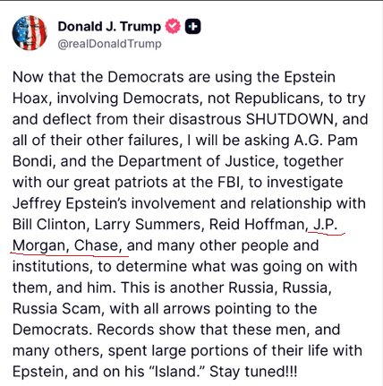 今回のトランプ大統領のツイートによりJPモルガンはエプスタインの金庫番として、国際的に犯罪を全面的に支援してきたことが改めて明らかになったわけです。