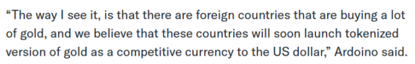 「大量の金を購入している外国政府があるが、これらの国家は近々トークン化された金を米ドルに競合する通貨としてローンチすると思われる」と述べています。